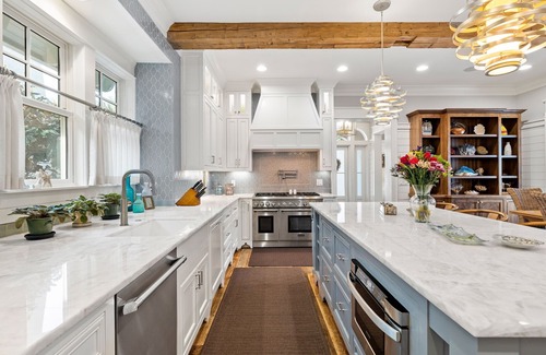 Exposed wood beams, stunning hardwood floors, and shiplap walls warmly welcome guests to this home. An expansive and open-concept floorplan ensures guests can spend ample time together in the main living space. The family room boasts two lush sofas, cozy armchairs, a flat-screen television, and a beautiful shell-inlay fireplace façade. The wet bar, conveniently located close to the kitchen and living areas, boasts granite countertops, a wine cooler, and all the bar + glassware you need to concoct the perfect beach cocktail. The gourmet kitchen is a cook's delight and features beautiful granite countertops, top-of-the-line stainless steel appliances, a walk-in pantry, and plenty of counter and cabinet space. The nearby dining table offers seating for 10 guests, with 4 additional seats available at the adjacent breakfast bar.